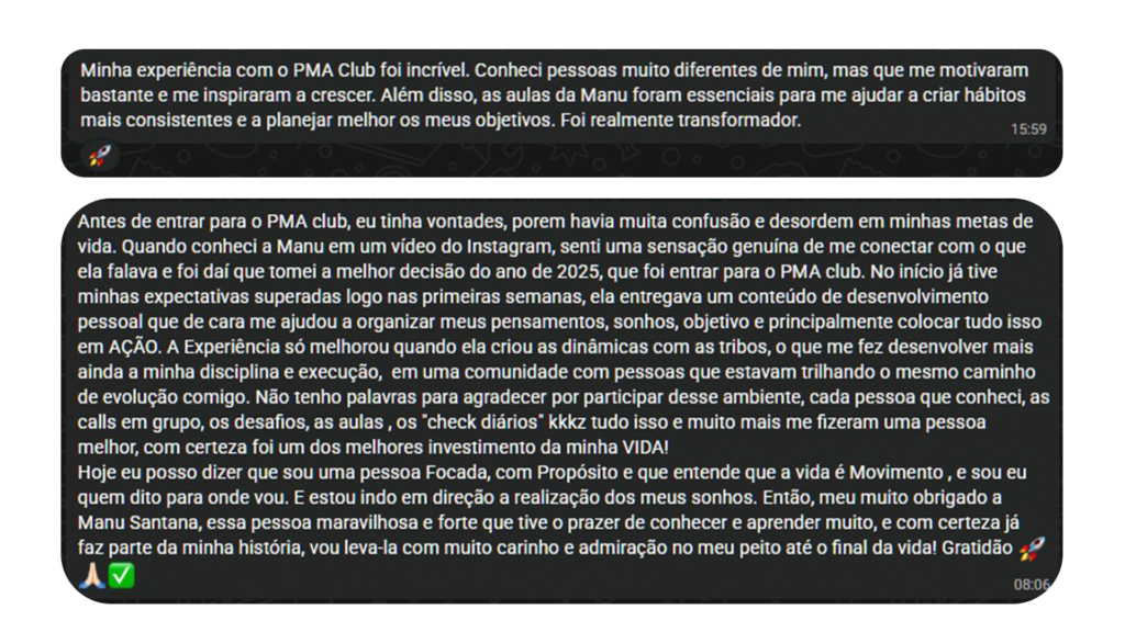 A sua forma de enxergar o mundo vai mudar, mas, principalmente, sua forma de enxergar você mesmo. Você agora será uma pessoa com sonhos claros e potenciais cristalinos. Você agora tem um plano de ação definido pra alcançar seus objetivos. Se a vida é movimento, por que não ajustá-la em direção ao que você quer? Venha com a coragem de alinhar a sua rota e transformar seus comportamentos, deixa que o restante o plano do PMA Club faz.